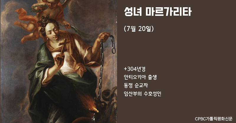 그리스어와 라틴어로 ‘진주’라는 뜻을 지닌 마르가리타 성녀는 안티오키아의 귀족 출신 이교도 사제 아이데시우스의 딸로 태어났습니다. 어머니를 일찍 여의고 독실한 그리스도인이었던 유모의 손에 자란 성녀는 일생을 하느님께 바칠 것을 결심했습니다. 아버지의 의심을 사서 추궁을 받자 성녀는 당당히 신앙을 고백했고, 결국 유모와 함께 집에서 쫓겨났습니다. 귀족 신분에도 불구하고 양을 치고 살아야 했지만, 신앙을 추구하던 그에게는 오히려 자유로운 생활이었습니다.
