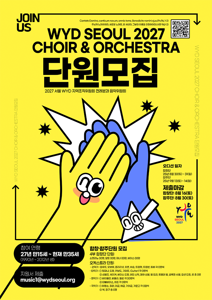 합창단원 지원은 8월 16일까지, 합주단원 지원은 8월 30일까지이며, 이메일(music1@wydseoul.org)로 신청하면 된다. 2027 서울 WYD 홈페이지(wydseoul.org/news/notice)에서 확인할 수 있다.