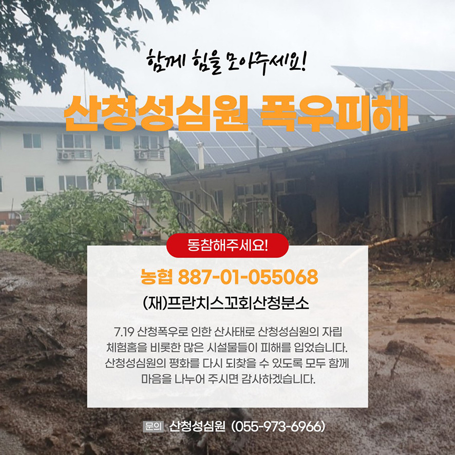 지난 7월 10여 명의 사망자가 발생한 경남 산청 지역 폭우로 피해가 극심한 성심원의 수해 복구를 위한 미사와 음악회가 23일 오후 4시 서울 정동 프란치스코회관 대성당에서 거행된다.