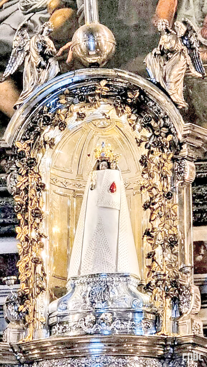 성당 정문을 지나면 중앙엔 웅장한 돔과 주 제대가 보입니다. 성당은 칠각형 평면 구조로 설계되었는데, 칠(七)은 성모 신심에서 중요한 상징입니다. 돔 아래 일곱 개의 기둥은 ‘성모 칠고(七苦)’를 구현해 놓았죠. 회랑을 따라 돌면 각 모서리에 있는 소성당과 제대가 눈에 들어옵니다. 주 제대에 작은 성모자상이 모셔져 있는데, 작지만 엄청난 기운이 뿜어져 나오는 것을 느낄 수 있습니다.