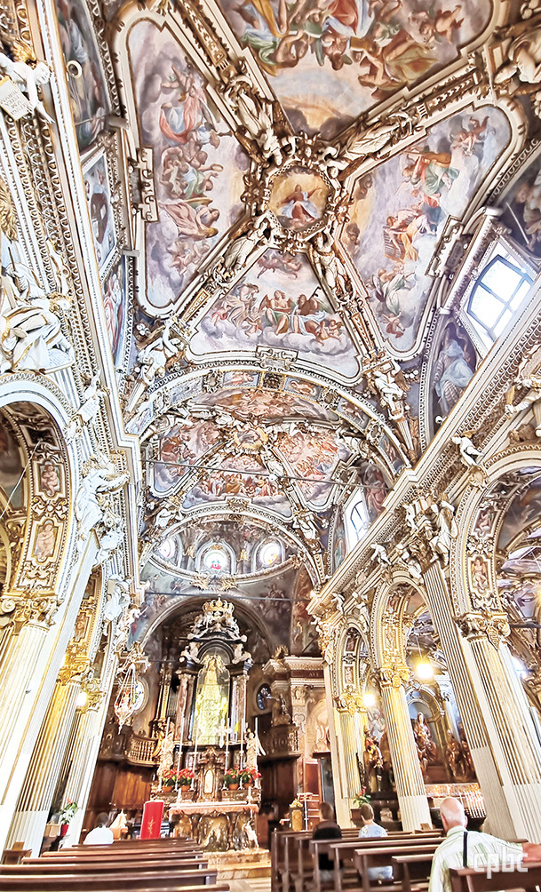 성모 성당의 현재 모습은 12세기의 소성당 위로 1472년에 재건한 것입니다. 허름한 외관과 달리 성당 안은 바로크 양식의 장식으로 화려합니다. 성당은 묵주 기도의 신비로운 장면으로 가득 차 있습니다. 주 제대는 영광의 신비 제5단의 천상 모후관을 쓰시는 성모님을 주제로 단장되어 있고, 천장에는 하늘로 올려지는 성모와 그 주위를 에워싼 천사들이 그려져 있어, 성산의 오르막길 전체를 이 한 장면으로 종결짓습니다.