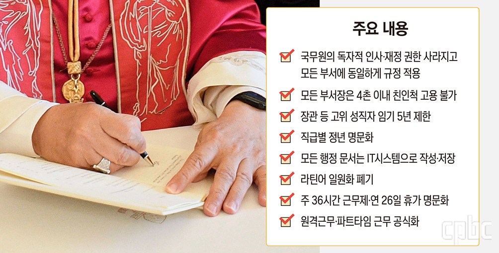 더불어 라틴어 일원화가 폐기된다. 기존에는 교황청 공식 문서를 원칙적으로 라틴어로 작성해야 했다. 새 규정에는 ‘라틴어 또는 다른 언어’로 작성하도록 변경됐다. 이를 통해 실무자들이 실제 사용하는 현대 언어인 영어나 프랑스어, 이탈리아어 등을 공식적으로 허용했다. 이는 행정의 정확성과 효율성을 높이려는 조치로 해석된다.