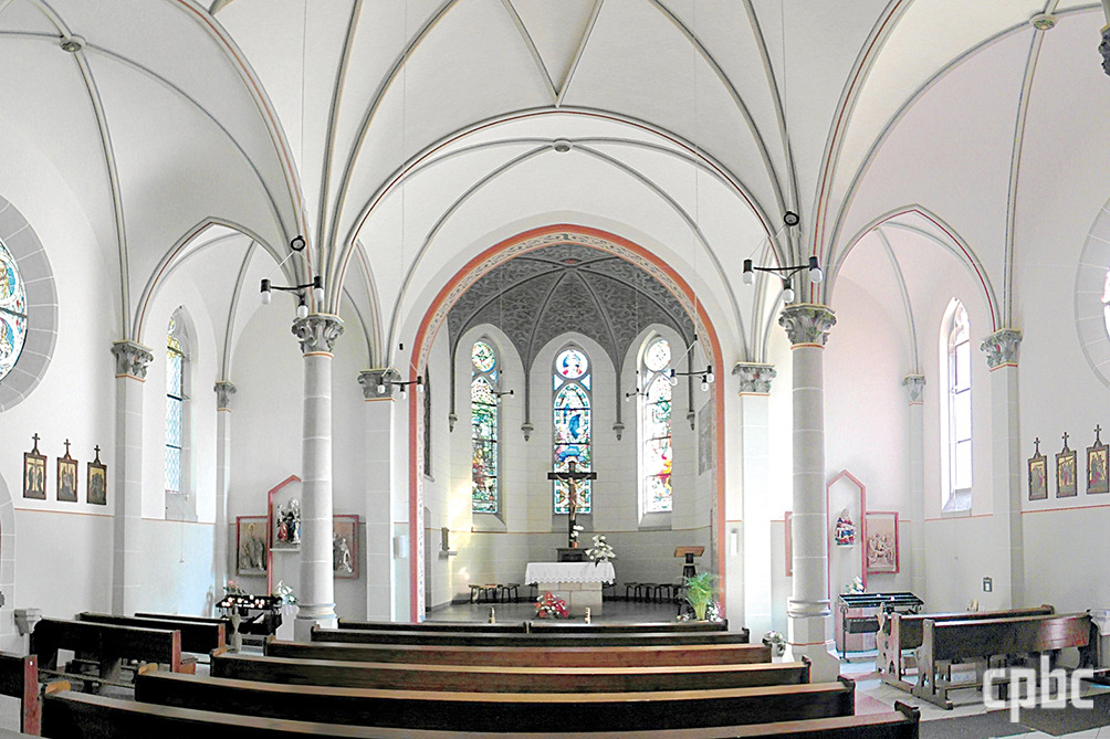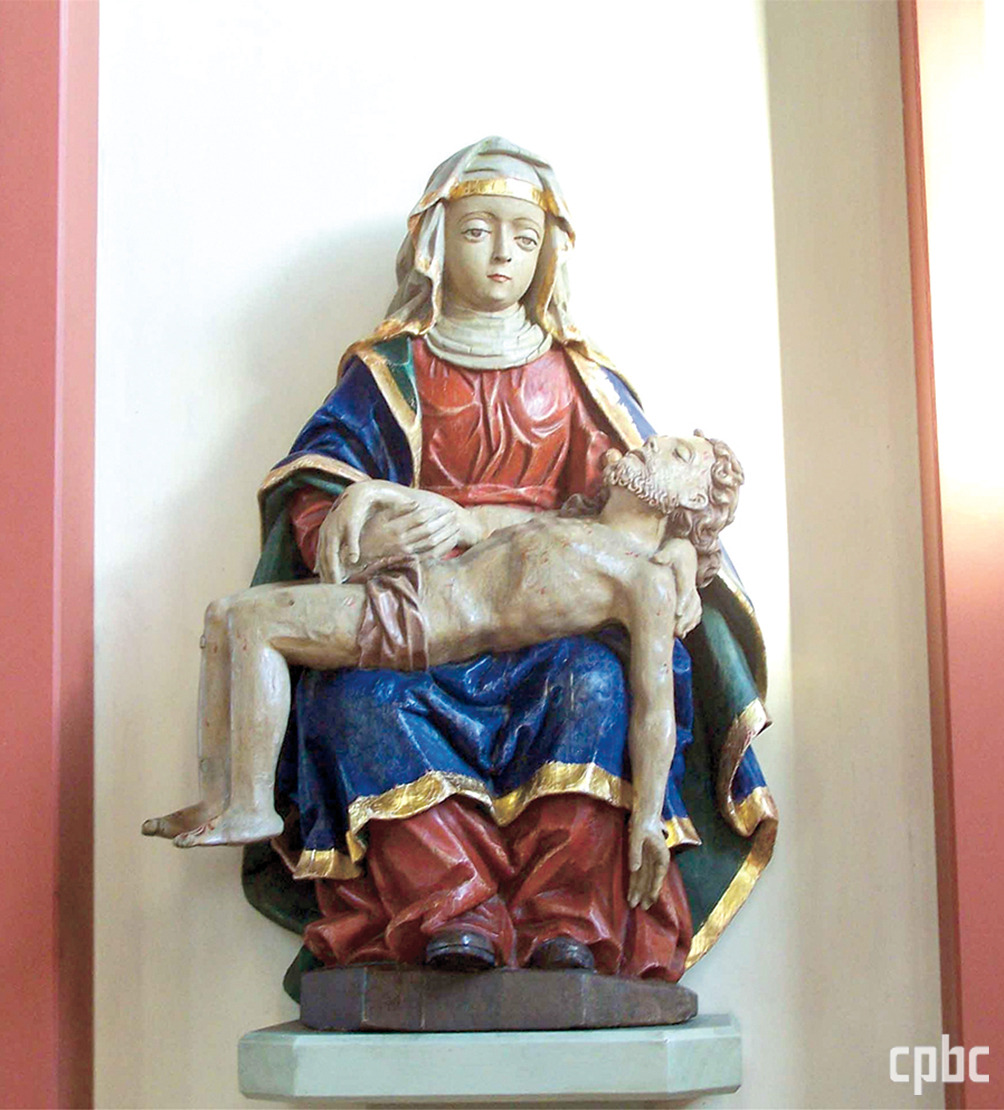 소성당 안으로 들어서면 넓고 밝은 공간이 펼쳐지는데, 곳곳에 위로와 희망의 모티프가 가득합니다. 단아한 주 제대 뒤의 스테인드글라스는 주보인 성모 승천의 모습을 담고 있습니다. 순례지의 기원이 된 피에타상은 소성당 남쪽 측랑에 모셔져 있습니다. 농민전쟁과 30년 전쟁, 흑사병과 두 차례 세계대전, 동서독 분단의 세월 동안 이 땅에 살던 이들이 피에타상 앞에서 눈물과 함께 위로를 청해왔지요.