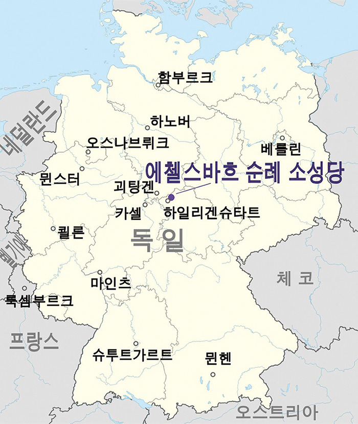 에첼스바흐는 중부 독일 한가운데 튀링겐주 북서쪽, 옛 동독 국경 구릉 지대인 아이히스펠트 지역에 있습니다. 괴팅겐에서 에르푸르트로 가는 아우토반 중간쯤에서 빠져나가면 금방입니다. ‘까마귀가 모여드는 개울’이란 이름대로 벌판을 가로질러 흐르는 개울가에 라임 나무로 둘러싸인 붉은 벽돌 소성당이 보입니다. 자칫 내비게이션 화면에서 놓칠 만큼 작습니다.
