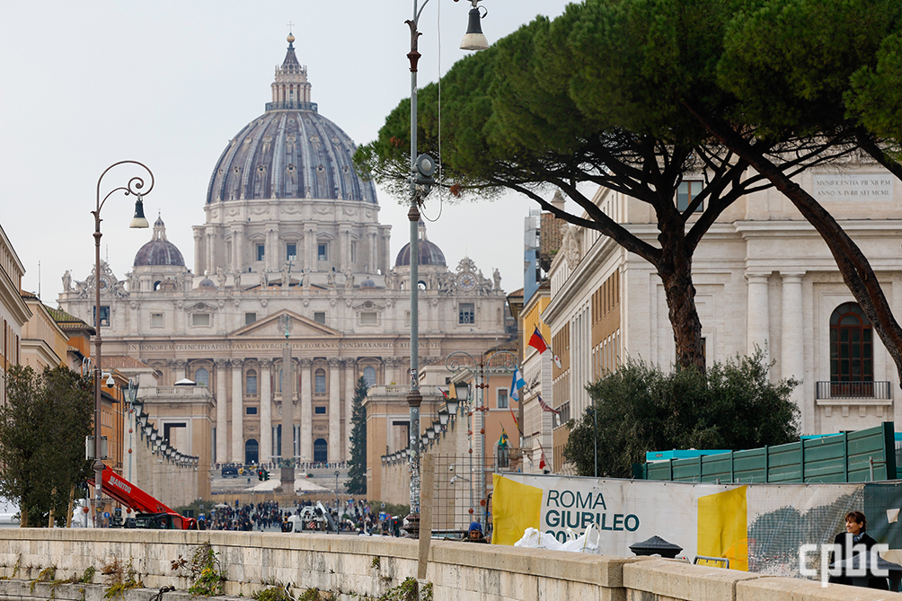 바티칸 성 베드로 대성전과 로마 산탄젤로 성을 연결하는 도로 한 가운데에 도보 설치 공사를 알리는 바리케이트가 설치되어 있다. OSV
