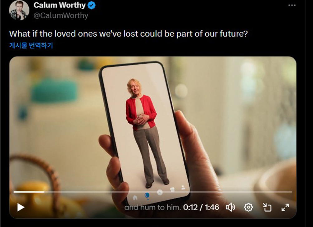 지난해 11월 한 AI 기업은 사용자가 영상과 음성 자료를 이용해 사랑하는 사람들의 생전 모습을 디지털로 구현하는 앱을 발표했다. 앱 공동 개발자인 칼럼 워디는 SNS에서 “이 기술이 우리가 잃은 사랑하는 사람들을 미래 일부가 되도록 해줄 수 있다”고 밝혀 주목을 받았다. 그러면서 한 가족이 돌아가신 할머니의 디지털 영상과 수년 동안 소통하는 모습을 담은 영상을 공개했다.
