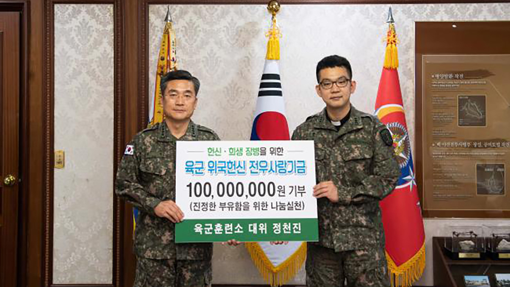 ‘육군 위국헌신 전우사랑 기금’에 1억 원을 기부한 현역 군인은 정 신부가 유일하다. 앞서 2020년에는 고액 기부자 모임인 ‘아너 소사이어티’ 회원이 됐다.