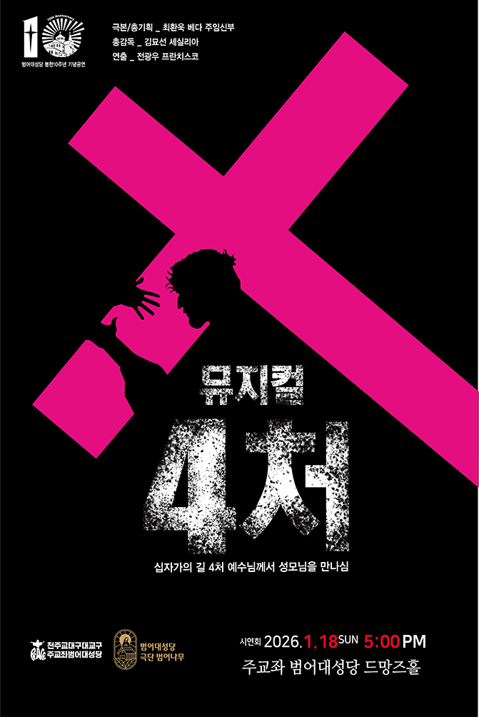 창작뮤지컬 ‘4처’가 3월 7일과 8일 대구대교구 주교좌 범어대성당(주임 이호봉 신부) 내 드망즈홀에서 공연된다. 범어대성당 봉헌 10주년을 맞아 기획된 이 작품은 십자가의 길에서 만난 예수님과 성모님, 죽음 앞에 선 예수님을 바라보는 성모님과 마리아 막달레나의 마음에 집중한다.