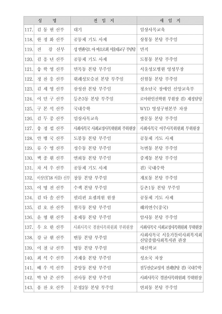 서울대교구=▲성사전담사제 임상만(안식년) ▲용인공원묘원 영성담당 송명은(임상사목교육) ▲성사전담사제 겸 인천교구 파견 문호영(인천교구 파견) ▲성사전담사제 겸 성 빈첸시오 아 바오로회 서울대교구 담당 이재을(성 빈첸시오 아 바오로회 서울대교구 담당) ▲성사전담사제 심흥보(등촌3동 주임) ▲성사전담사제 이기헌(오류동 주임) ▲제주 엠마오의 길 연수 임인섭(대치동 주임) ▲성사전담사제 장희동(수서동 주임) ▲성사전담사제 고찬근(안식년) ▲협력사목사제(목동) 유도마스(신사베드로 주임) ▲성사전담사제 한상문(안식년) ▲상계동 주임 김찬회(원주교구 파견 올산 공소) ▲협력사목사제(중계동) 윤재한(장위동 주임) ▲성사전담사제 김범연(중계동 주임) ▲안식년 박근태(신대방동 주임) ▲원주교구 파견(월송 공소) 강계원(월계동 주임) ▲성사전담사제 겸 사목국 영성지원팀(향심기도) 이승구(사목국 향심기도) ▲협력사목사제(방배동) 겸) Curator 김명섭(대신학교 겸 Curator) ▲한강 주임 임용환(사목국 상설고해) ▲안식년 조정래(가톨릭평화방송·평화신문 사장) ▲대기 이용희(사목국 상설고해) ▲협력사목사제(천호동) 겸) 교리신학원 연구위원 윤종국(안식년) ▲사목국 영성지원팀(영성심리상담교육원 부원장) 문종원(주교좌 기도 사제) ▲안식년 정민수(대신학교) ▲중계동 주임 이정호(안식년) ▲가톨릭대학교 성의교정 박준양(레지오마리애 서울세나뚜스 담당) ▲성사전담사제 남궁은(수유1동 주임) ▲대기 박성우(서초동 주임)▲녹번동 주임 김현덕(안식년) ▲협력사목사제(개포동) 유철(노량진동 주임) ▲원주교구 파견(올산 공소) 장광재(안식년) ▲성산2동 주임 김남원(원주교구 파견·월송 공소) ▲정릉동 주임 김충섭(사목국 상설고해) ▲대신학교 유승록(주교좌 기도 사제) ▲휴양 박준호(우이 주임) ▲주교좌 기도 사제 허윤진(안식년) ▲협력사목사제(목5동) 조원필(안식년) ▲안식년 장혁준(광장동 주임) ▲월계동 주임 양해룡(제13 관악지구 지구장) ▲사목국 영성지원팀(상설고해) 이계호(서울성모병원 영성부장) ▲주교좌 기도 사제 김현규(삼성동 주임) ▲미사도움사제 이계천(중곡동 주임) ▲협력사목사제(가락동) 원성묵(화양동 주임) ▲협력사목사제(여의도동) 김영철(중앙동 주임) ▲안식년 조영관(동성고등학교 겸 동성중학교 교장) ▲안식년 이형기(상계동 주임) ▲협력사목사제(둔촌동) 김성권(녹번동 주임) ▲우이 주임 박경근(휴양) ▲동성고등학교 교장 허석훈(한강 주임) ▲가톨릭평화방송·평화신문 사장 성기헌(가톨릭대학교 성의교정) ▲대신학교 이도행(성산2동 주임) ▲안식년 배한상(대신학교) ▲광장동 주임 유정규(안식년) ▲서초동 주임 이성진('00 서품)(주교좌 기도 사제) ▲제13 관악지구 지구장 이승민('02 서품)(쑥고개 주임) ▲주교좌 기도 사제 최재영(정릉동 주임) ▲협력사목사제(절두산·서소문순교성지) 김영식(행운동 주임) ▲신사베드로 주임 현대일(안식년) ▲WYD 영성구현본부장 권구택(국내수학) ▲대치동 주임 은성제(청소년국 가톨릭청소년이동쉼터(서울A지T) 소장) ▲삼성동 주임 이정훈('04 서품)(남대문시장(준) 주임) ▲중앙동 주임 이재일(청계시장(준) 주임) ▲가톨릭대학교 성신교정 최규하(대흥동 주임) ▲노량진동 주임 이대수(베드로사목연수) ▲안식년 노수장(동대문시장(준) 주임) ▲동대문시장(준) 주임 김우종(대기) ▲휴양 이욱진(베드로사목연수) ▲수서동 주임 윤종상(사회사목국 서울가톨릭사회복지회 신당종합사회복지관 관장) ▲휴양 유기상(시흥동 주임) ▲안식년 백중서(상도동 부주임) ▲오류동 주임 손경락(가톨릭대학교 성심교정) ▲신대방동 주임 전성주(군종) ▲시흥동 주임 임창재(베드로사목연수) ▲중곡동 주임 송영욱(목동 부주임) ▲레지오마리애 서울세나뚜스 담당 양경모(휴양) ▲쑥고개 주임 박태민(베드로사목연수) ▲화양동 주임 서성훈(청담동 부주임) ▲장위동 주임 김형균(사회사목국 경찰사목위원회 위원장) ▲등촌3동 주임 김원호(사회사목국 서울가톨릭사회복지회 부회장) ▲대흥동 주임 김원철(베드로사목연수) ▲행운동 주임 김시몬(사회사목국 노동사목위원회 위원장) ▲국내수학 손훈(녹번동 부주임) ▲베드로사목연수 김영호(공동체 기도 사제) ▲베드로사목연수 김영훈(일원동 부주임) ▲수유1동 주임 한승현(베드로사목연수) ▲베드로사목연수 이태훈(오금동 부주임) ▲공동체 기도 사제 송환진(당산동 부주임) ▲공동체 기도 사제 문세영(목5동 부주임) ▲청계시장(준) 주임 주국돈(베드로사목연수) ▲통합사목연구소 부소장 이규동(해외유학) ▲남대문시장(준) 주임 장인수(베드로사목연수) ▲베드로사목연수 최영진('12 서품)(양재동 부주임) ▲면 사회사목국 병원사목위원회 국립중앙의료원 원목실장 김영규(사회사목국 병원사목위원회 국립중앙의료원 원목실장 겸 순천향대학병원 원목실장) ▲문정2동 부주임 김민호(WYD 기획 사무국 차장) ▲베드로사목연수 강철호(개포동 부주임) ▲베드로사목연수 전동진(둔촌동 부주임) ▲가톨릭대학교 성심교정 임용우(해외연수) ▲베드로사목연수 송인회(방