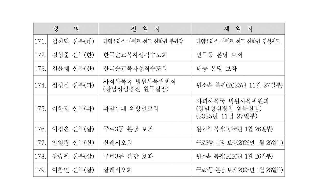 ▲원소속 복귀 심성심(과)(사회사목국 병원사목위원회 강남성심병원 원목실장) ▲사회사목국 병원사목위원회(강남성심병원 원목실장) 이한결(과)(과달루페 외방선교회) 2025년 11월 27일 부