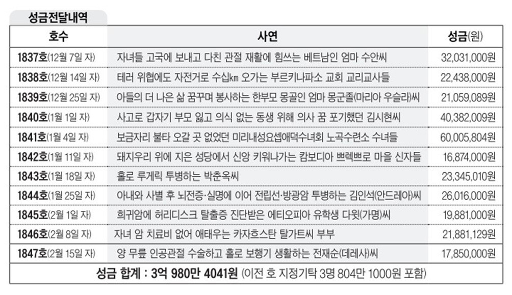 이날 행사에서는 본지 1837호(12월 7일 자)부터 1847호(2월 15일 자)에 사연이 실린 11명에게 3억 980만 4041원이 전달됐다.