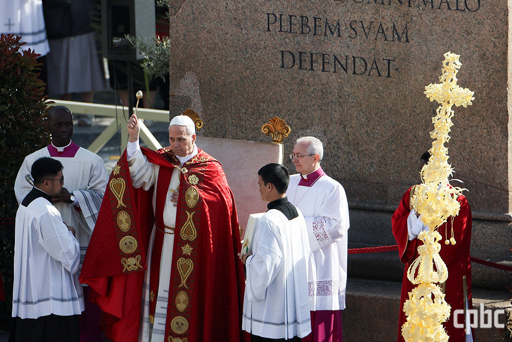 레오 14세 교황이 3월 29일 바티칸 성 베드로 광장에서 거행한 주님 수난 성지 주일 미사에서 성수를 뿌리고 있다. OSV